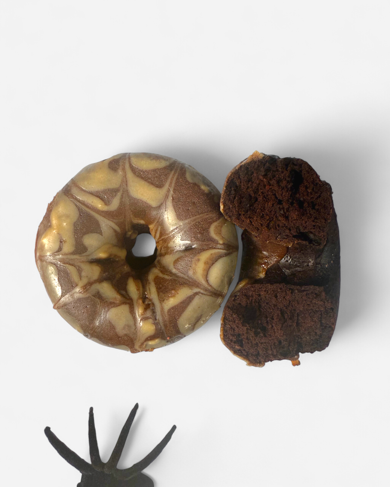 Chocolate (base banana): donut de plátano cubierto con glaseado oscuro y diseño de telaraña.